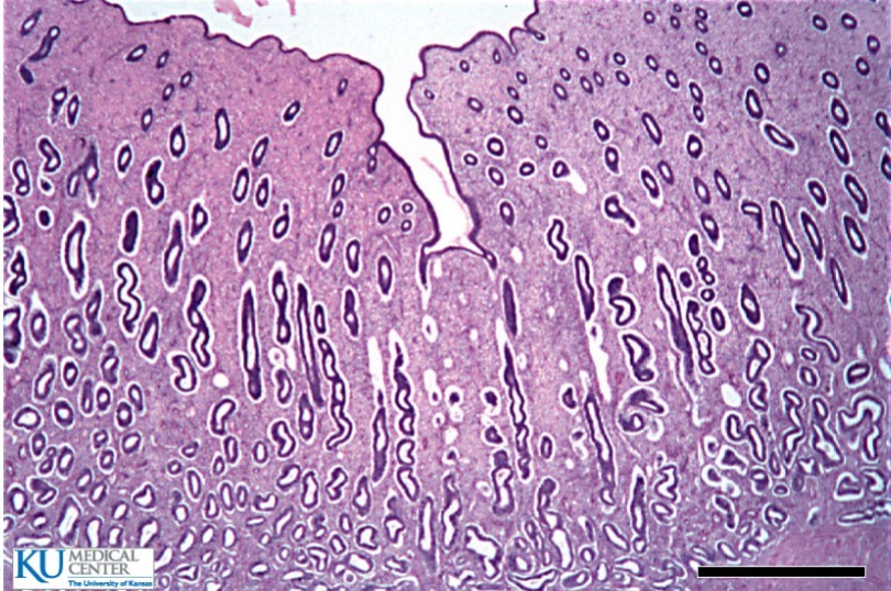 The mucosa is lined by a ciliated columnar epithelium with secretory cells, and is folded out into the lumen so that an ovum in the lumen will always be close to the cilia for transport to the uterus