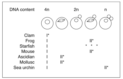 Eggs arrest having completed meiosis. Eggs are shed and fertilized at interphase (G1) of the first mitotic cell cycle (mammals arrest but in second meiotic cycle)