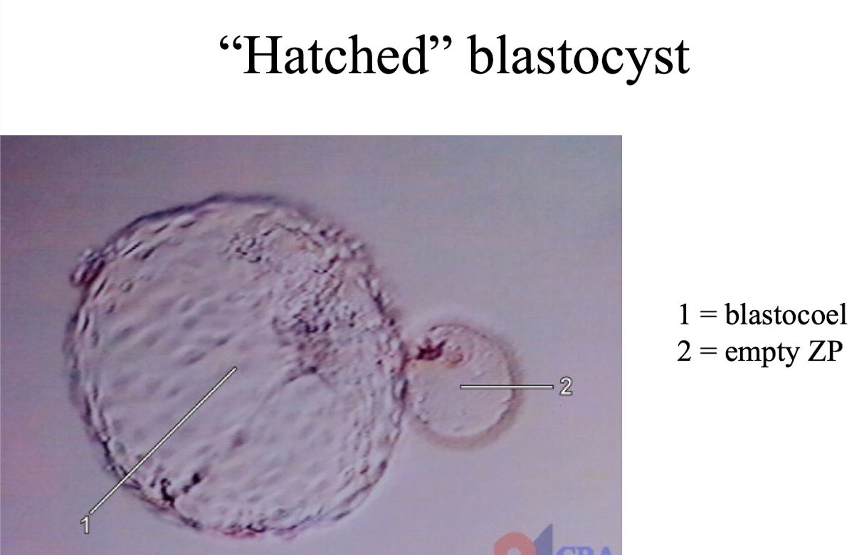 Recall: @ fertilization, oocyte has NOT complete meiosis; all 2º oocytes remain arrested in metaphase of meiosis II until fertilzation. At Fertilization, Meiosis II is completed, -> second polar body (containing unneeded complement of genetic material from meoisis) is ejected, and the oocyte becomes an ovum = haploid (1n) gamete.