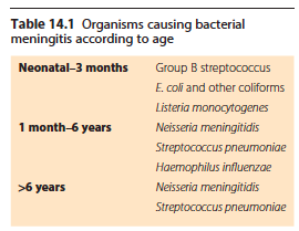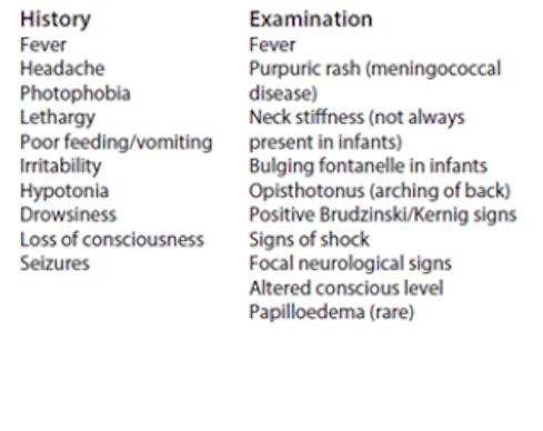 Shown below, including the differences in the CSF for each type of meningitis. The early signs and symptoms are non specific, especially in the very young. Classic headache, photophobia and neck stiffness will only be described by those old enough to talk. Still other causes can also give neck stiffness.