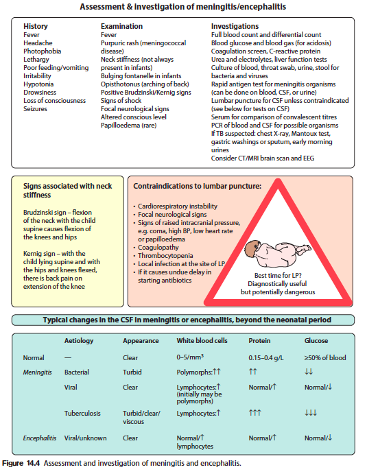 Essential ones are shown in the figure, along with their characteristic findings. Exceptions do occur. Also in the figure are the list of contraindications for doing an LP, this should not be done to prevent coning of the cerebellum through the foramen magnum.