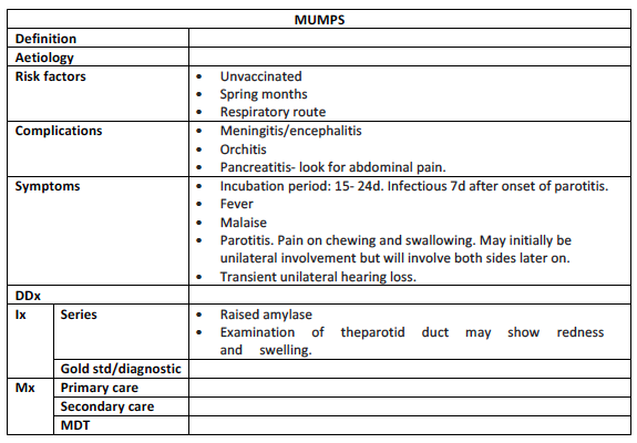 Mumps is an acute systemic infectious disease caused by an RNA paramyxovirus. It is spread by the resp droplet route. Before the vaccine it used to affect mostly children and would cause parotid gland swelling.