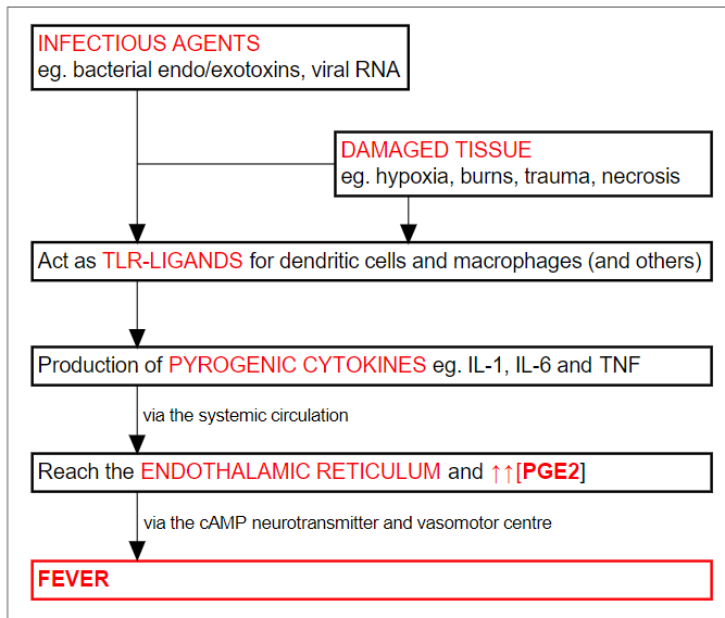 • During fever [PGE2]↑↑ in hypothalamic tissue and