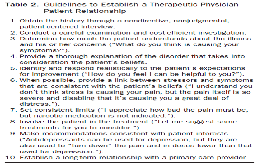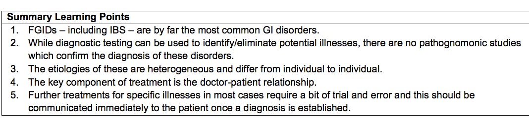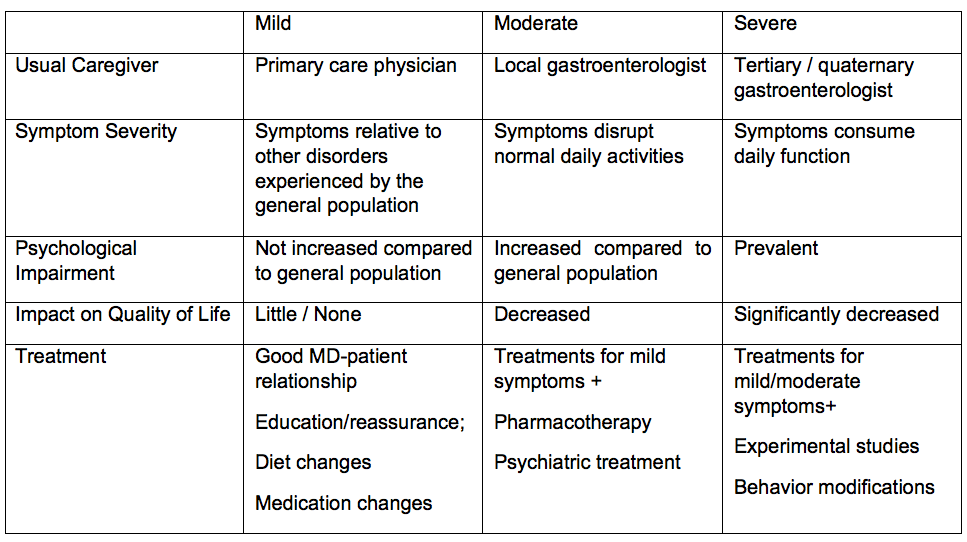 The treatment of FGIDs is difficult because each disorder has its own set of prevailing symptoms which can wax and wane in severity. Furthermore, FGIDs can present as isolated disorders, overlap concurrently, and change over time into completely different FGIDs. Therapeutic generalizations can, however, be made. Like many other medical conditions, FGID symptoms can be categorized as mild, moderate, or severe and the type of treatment(s) to be implemented can be based on these classifications. The most important intervention in the treatment of FGIDs is the establishment of an appropriate physician-patient working relationship. This results in reductions in health care seeking behavior and symptom improvement across this entire spectrum of illnesses.