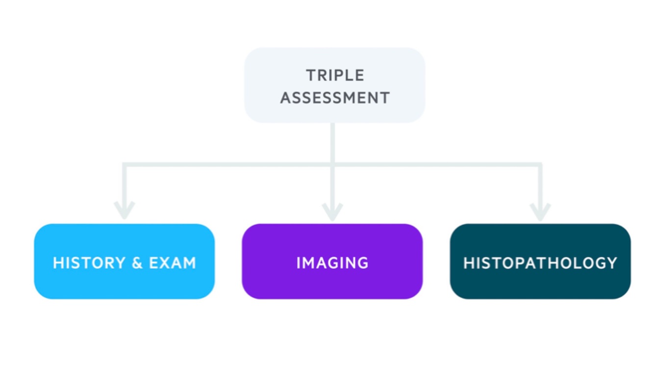 The one-stop breast clinic incorporates a triple assessment in one appointment. The majority of patients can be reassured that they do not have evidence of breast cancer following a single visit. Some may need to await further tests (e.g. core biopsy results) whilst others may be given a likely diagnosis.