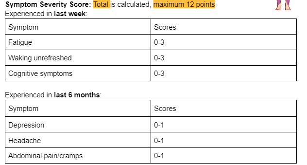Symptoms experienced in last week are individually rated from 0-3: fatigue, cognitive symptoms, waking up unrefreshed