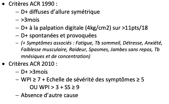 Quel est la définition de la fibromyalgie suivant les critères ACR de 1990 et 2010?