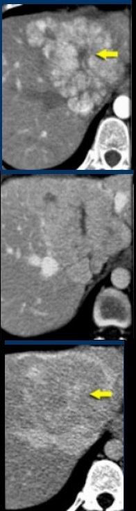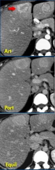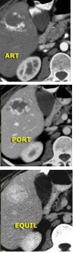Um adenoma é regularmente caracterizado por sangramento, gordura ou peliose. Embora não possamos ver a própria peliose, ela pode resultar em uma lesão hiperintensa no T1. Na imagem, dois incidentalomas. Decida por si mesmo porque estas não são lesões de FNH. Na fase arterial, existem duas lesões hipervasculares, um pouco menos densas do que seria de esperar na HNF. Ambas as lesões demonstram um halo de uma cápsula, que não deve ser aparente na HNF. Diferentemente da HNF, o realce não é homogêneo e na fase de portovenous e equilíbrio as lesões não são isodens para o fígado.