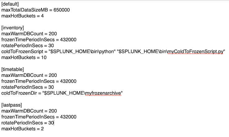 Consider this segment of a indexes.conf file. What is the max buckets that are applied to the inventory index, the timetable index and the lastpass index respectively? Why?