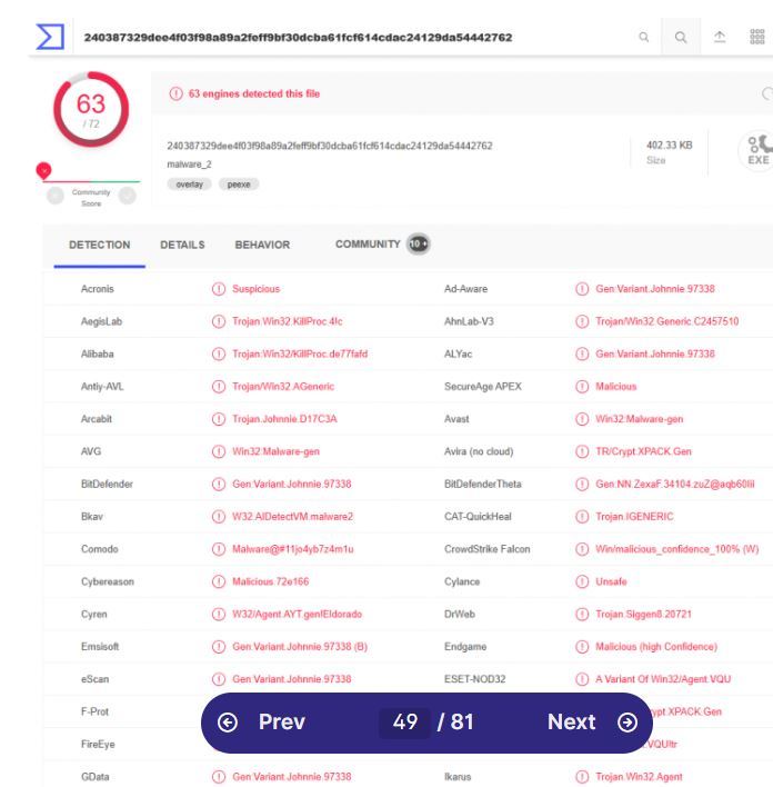 In this example, we’re going to upload an old piece of malware, which we know will be detected by a number of security vendors – this will allow you to see what malicious files look like once they’ve been submitted for analysis. In the below screenshot you can see that 63/72 vendors have detected this file to be malicious. In the top bar, it tells us that the file size is 402.33 KB and is a .exe file. If you upload a file that has even a few engines/vendors in red, then the file is most likely malicious in nature and defensive measures should be put in place (we’ll cover this later).