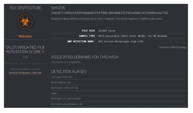 This service, offered by Cisco, allows us to search for SHA256 strings against their reputation database to determine if it has been classed as malicious by their products; AMP, FirePower, ClamAV, and open-source Snort product lines. This database of information is called the “Talos File Reputation system”.
