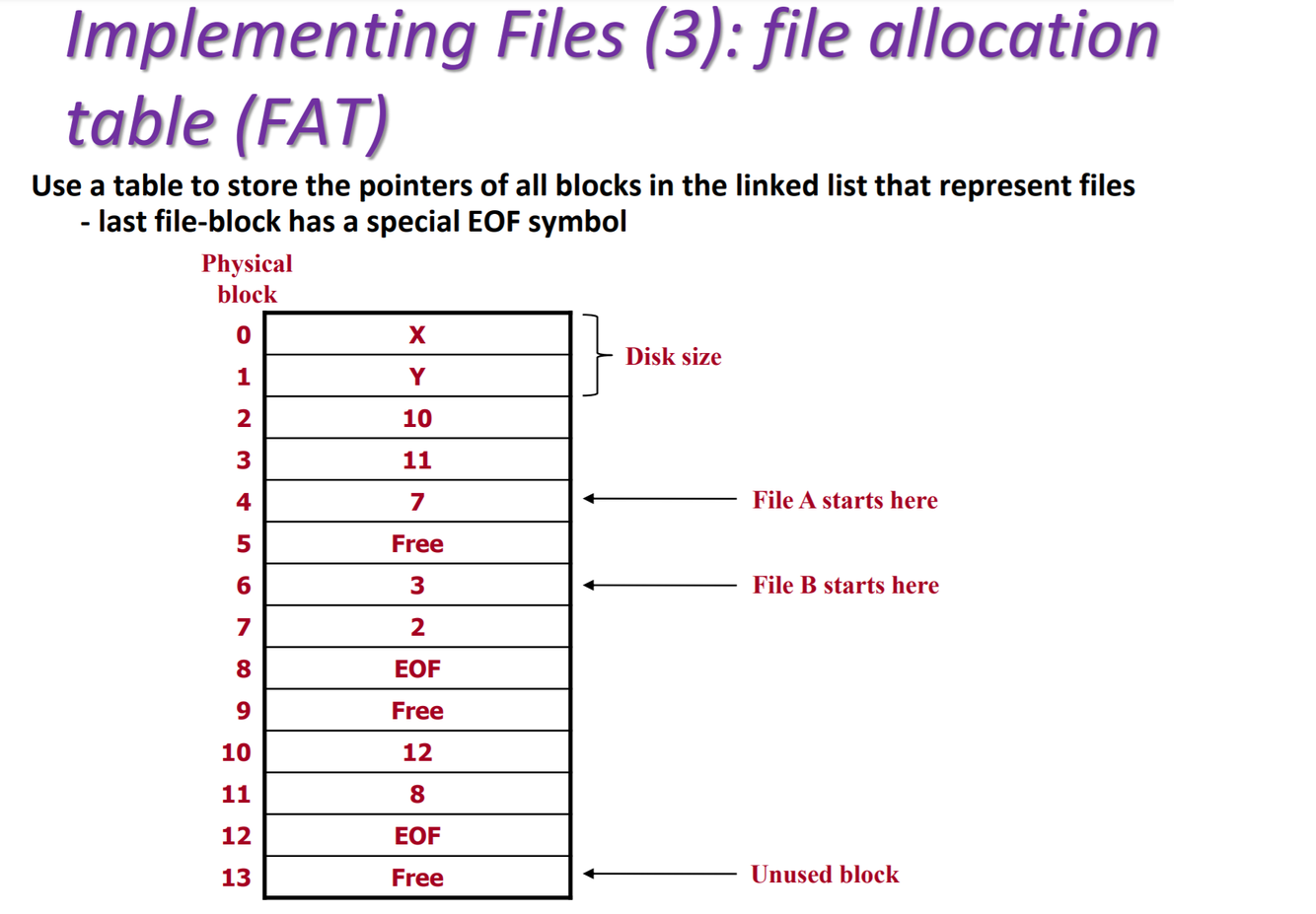Linked list of disk blocks: