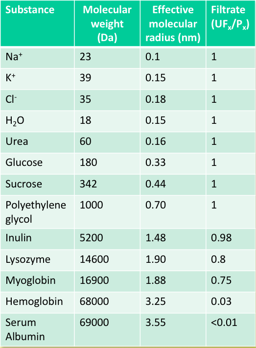 What determines the filterability of solutes across te glomerular filtration barrier?