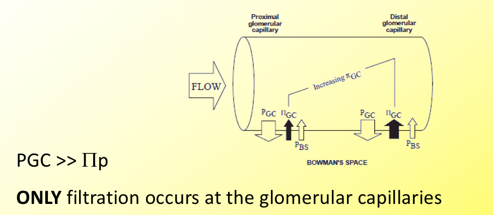 It is dependent on the balance between the hydrostatic forces favouring filtration and the oncotic pressure forces favouring reabsorption. (Starling’s forces).