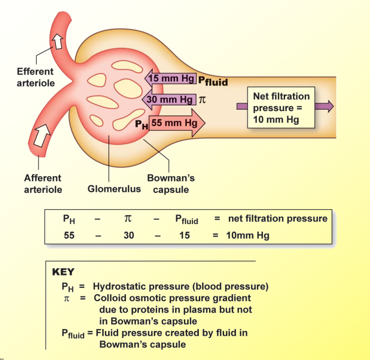 Hydrostatic pressure minus the colloid osmotic pressure plus the fluid pressure creasted by fluid in the bowmans capsule