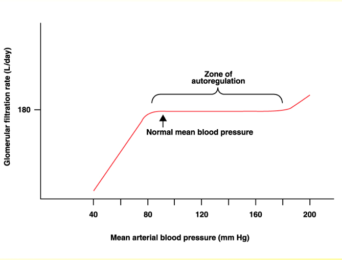 Below 60mmHg, filtration falls and ceases altogether when MBP = 50mmHg.