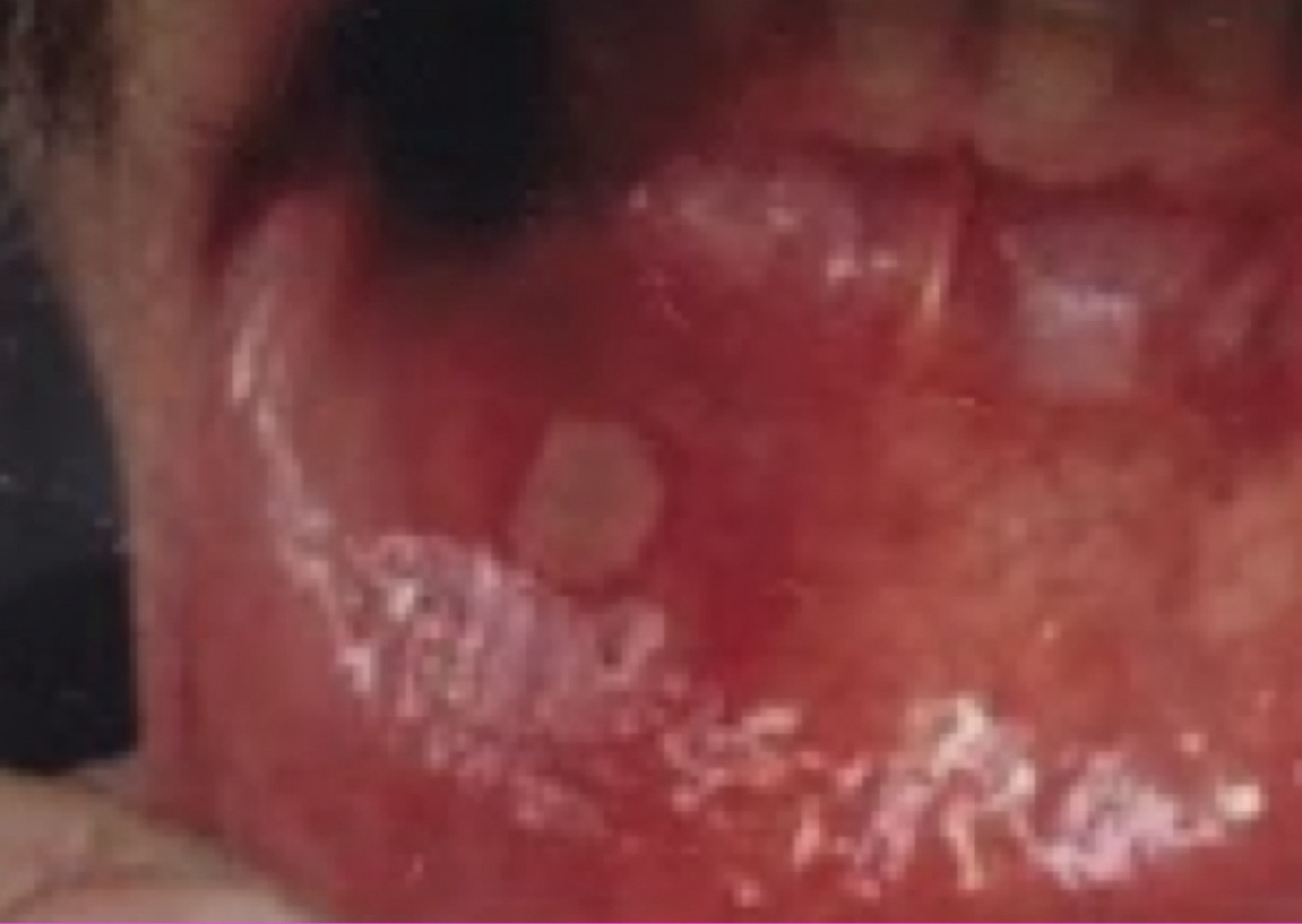 In doing an oral exam, you see this lesion in the patient’s mouth. It is painful. Identify it: