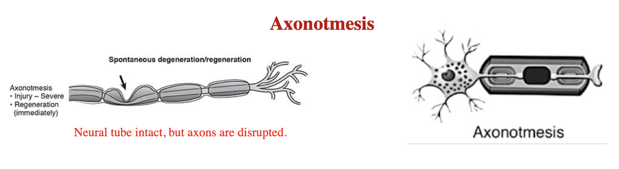 Axonotmesis: It is a more severe injury as compared to Neurapraxia. Afferent nerve fibers undergo degeneration, but the nerve trunk is grossly intact.