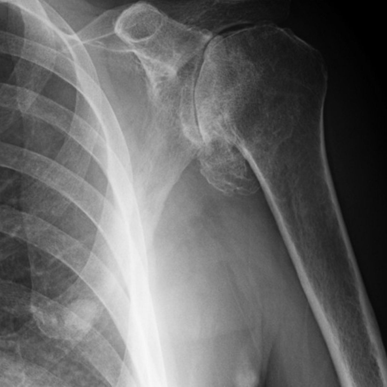 Femenino de 63 años de edad, con gonalgia y coxalgia bilateral, antecedente de prótesis de cadera derecha y rodilla izquierda, encuentra usted desviación de dedos de las manos hacia cubital, uso crónico de prednisona y sulfazalacina, llega a su consulta por dolor de hombro izquierdo de 6 meses de evolucion, intensidad 8/10, irradiacion hacia escapula, limita la flexion a tal grado que no logra peinarse, rotacion externa a 5°, rotacion interna 10°, con crepitos a la abduccion de 65°. Cuenta con el siguiente estudio de imagen: