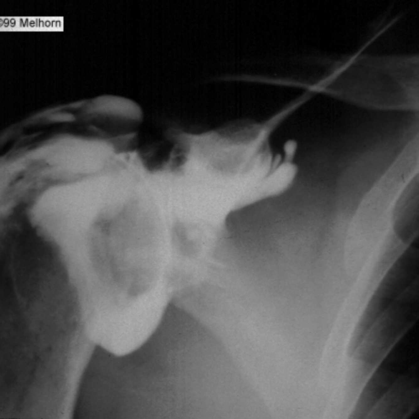 Masculino de 40 años de edad, mano derecha siendo la dominante, acude por dolor en hombro derecho e inestabilidad al levantar su brazo por arriba de la cabeza, refiere luxación glenohumeral derecha hace 2 semanas mientras esquiaba. a la exploración física, tolera flexión de hombro a 30°, rotación externa 15° con fuerza muscular 3/5, dolor a la movilización pasiva, sensibilidad conservada. una Resonancia Magnética esta contraindicada, debido a que porta un marcapasos, por lo que se realiza la siguiente artrografía