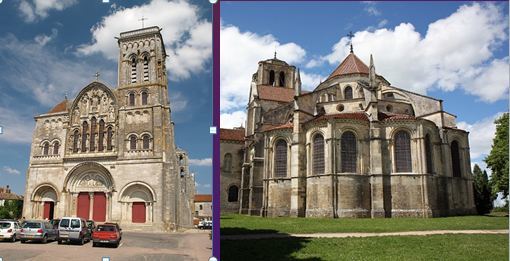 -Vezelay -originally a Cluniac dependency, until it was declared a monastery before 1161 -west facade restored by Viollet le Duc in 1840 -the chevet (apsidal chapels being Romanesque, clerestory level is Gothic with flying buttresses for choir vaults)