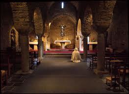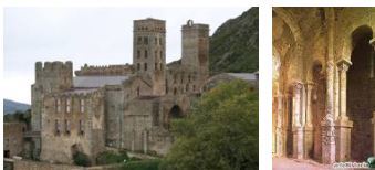 -Catalonia, Spain -c1035 -early example of ribbed barrel vaults in three aisle structures -barrel vault reinforced by transverse arches in nave -columns derived from Corinthian order