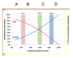 The graph below shows the relationship between the intensity of exercise and relative contribution of carbohydrates/lipids to ATP production. What exercise intensity range would you suggest to an overweight individual to efficiently burn fat?