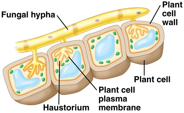 Some hyphae produce __________, projections that press into plant cells without breaking through the plasma membranes