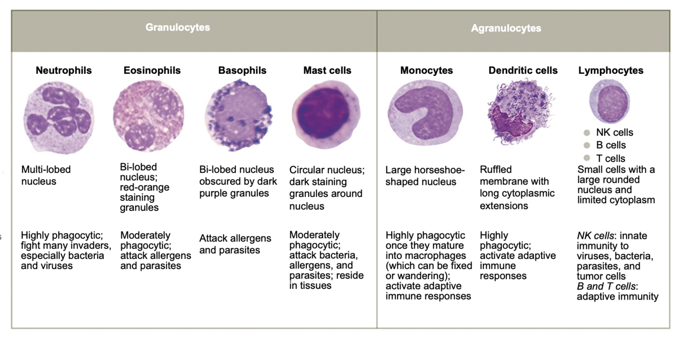 Mast cells – round nucleus with dark granules, reside in tissues; mediate allergy, inflammation, and parasite defense.