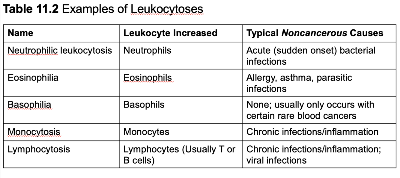 Use Table 11.2: Match each leukocytosis with the leukocyte increased and its typical noncancerous cause.