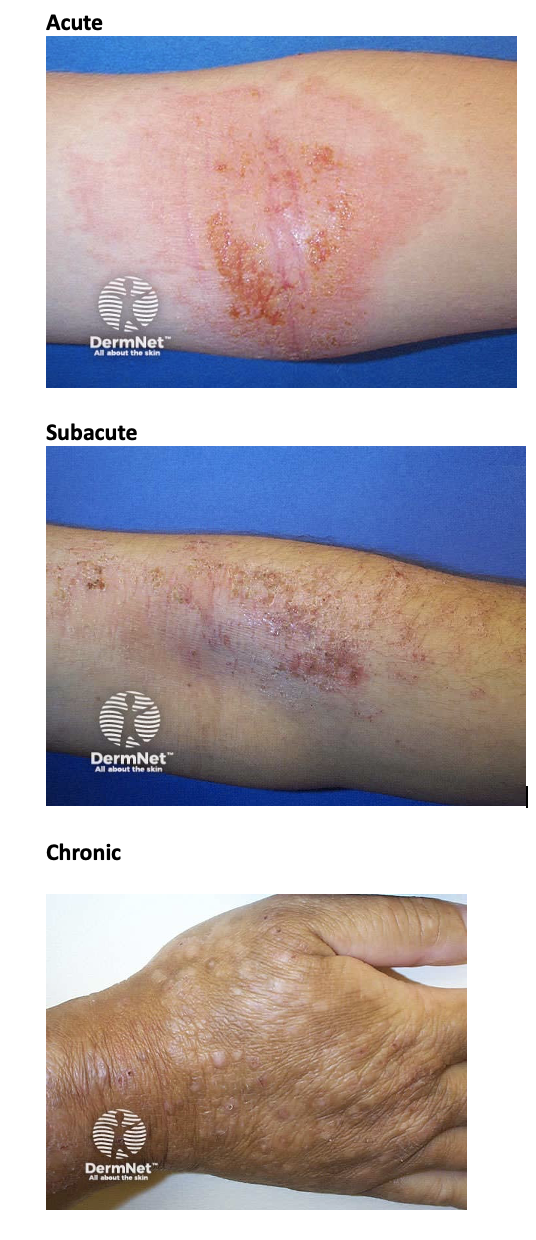 Which diagnostic factors / characterisitic features are associated with acute [3] subacute [1] and chronic [3] flares of eczema?