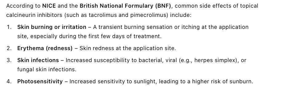 What are the common side effects of topical calcineurin inhibitors? [4]