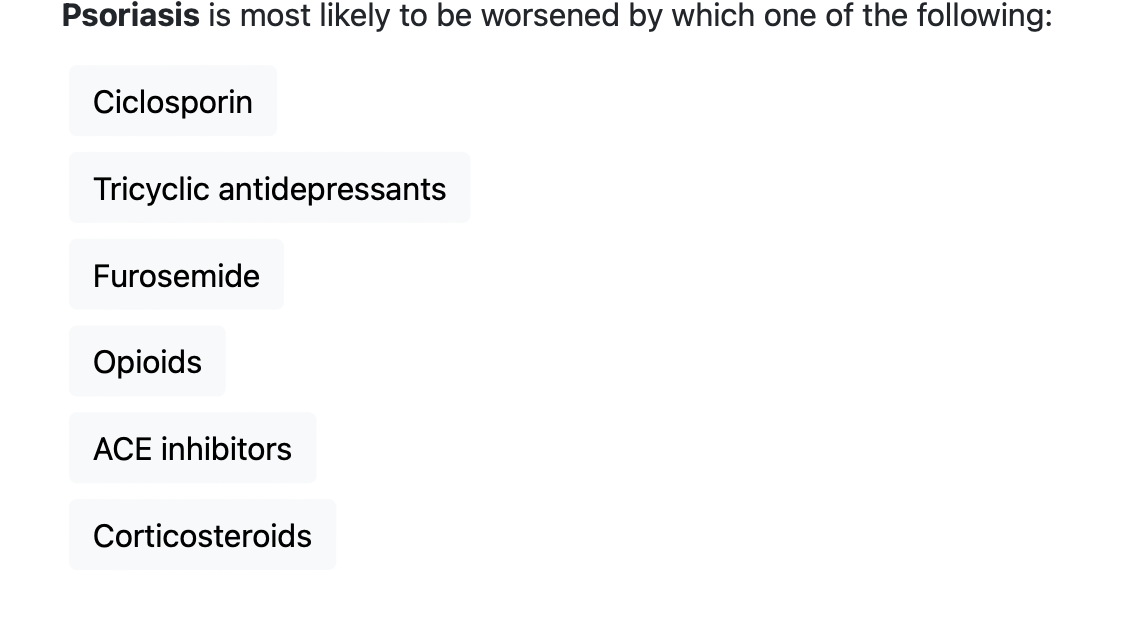 * drugs: beta blockers, lithium, antimalarials (chloroquine and hydroxychloroquine), NSAIDs and ACE inhibitors, infliximab
