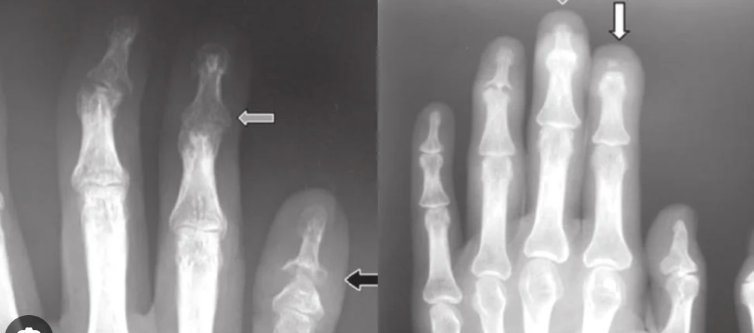 TOMTIP: The classic x-ray finding in the digits is a “pencil-in-cup” appearance.