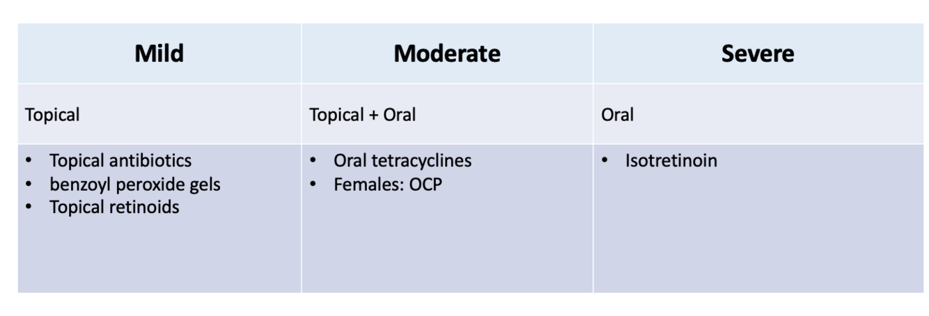 Describe the mangement of mild, moderate and severe acne vulgaris [+]