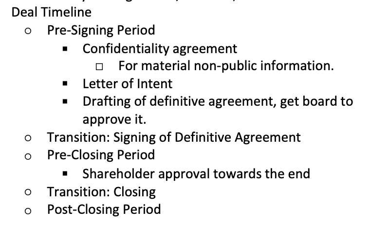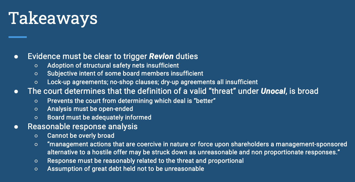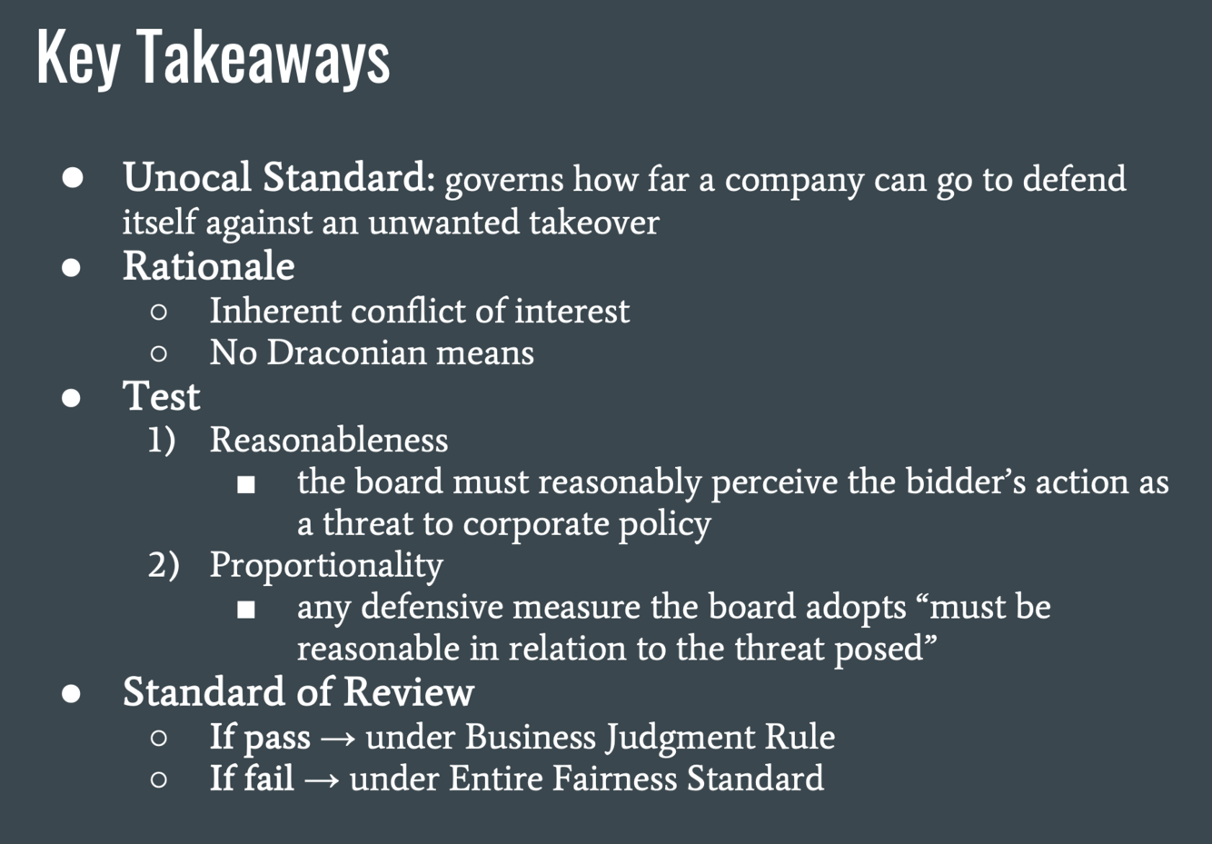 Note: If there is no change of control (like you have lots of unaffiliated shareholders), there’s no change of control to trigger the duty —more likely to trigger Revlon if there’s a sale of control and if it’s a cash sale!