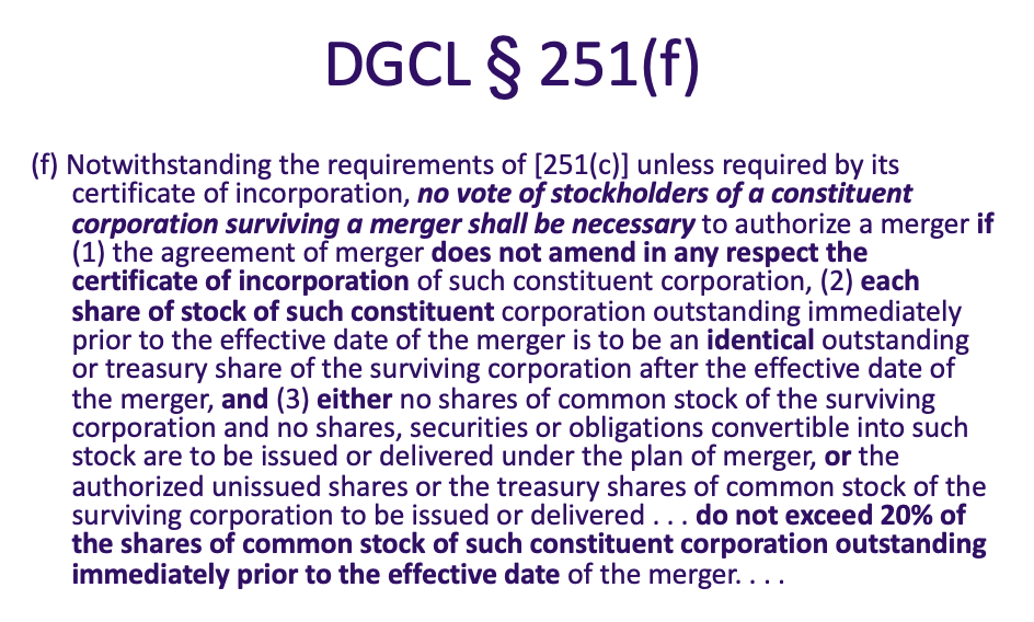 Under DGCL § 251(f), the shareholders of the surviving corporation are not required to vote on the merger if each of the following conditions is satisfied: