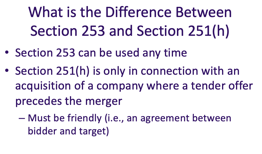 If at least 90% of each class of shares is held by a party and the merger is with that party or another company designated by that party (DGCL 253) —then no vote is reuiqred.