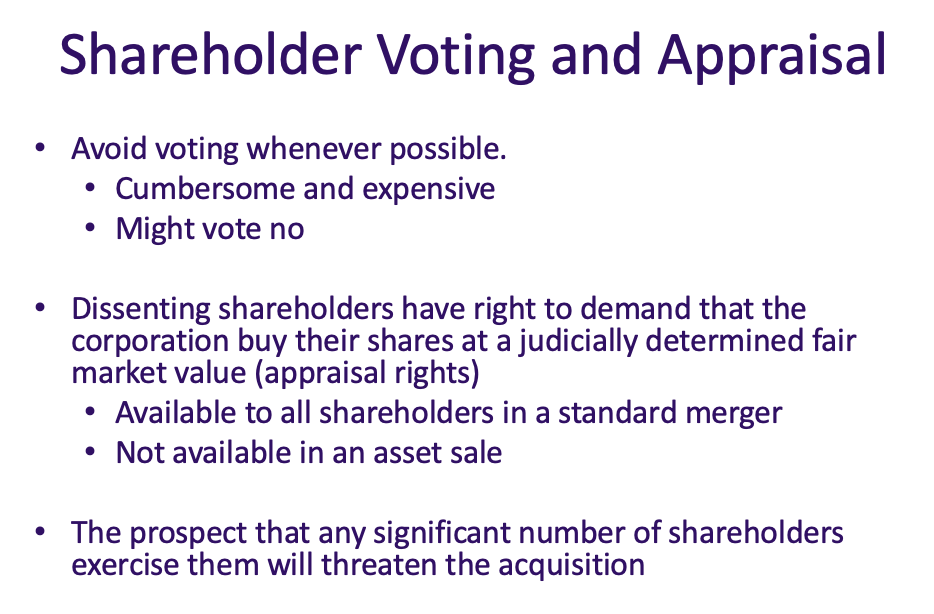 Under normal contract rules, to buy out shareholders, or move them, would require unanimous consent. Statutes modify this — provides for majority voting. Statutes provide procedural protections for shareholders given that they’re giving up a veto vote.