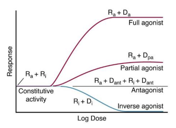 Describe a graph showing constitutive activity, full agonist, partial agonist, antagonist, and an inverse agonist