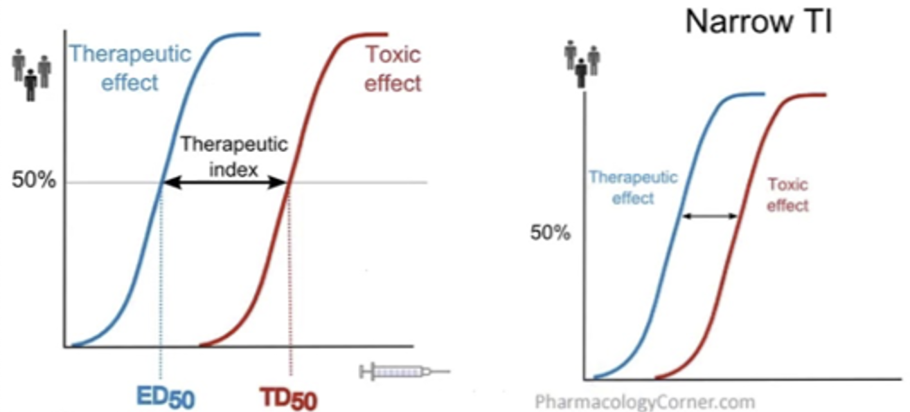 The larger the therapeutic index the safer the drug is; est. margin of safety