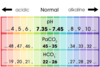 pH Normal range: 7.35–7.45 and Metabolic acidosis: Less than 7.35.