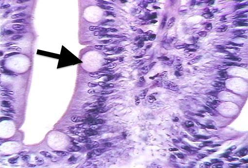 These cells secrete mucus; present in villi and crypts; numbers tend to increase aborally throughout the length of the intestine