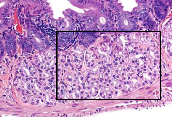 Identify the structures within the box in this H&E section of the submucosal region of the duodenum