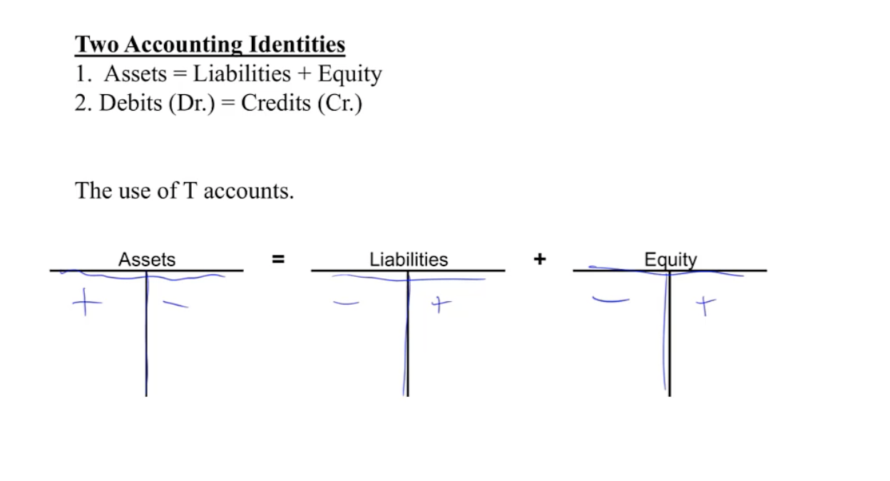 The ‘+’ sign goes on the same side of the T account as the T account is on WRT the ‘+’ sign. i.e. the Assets T is on the left side of the ‘=,’ therefor the ‘+’ goes on the left. The Liabilities and Equity are on the right side fo the ‘=’ and therefor the ‘+’ goes on the right