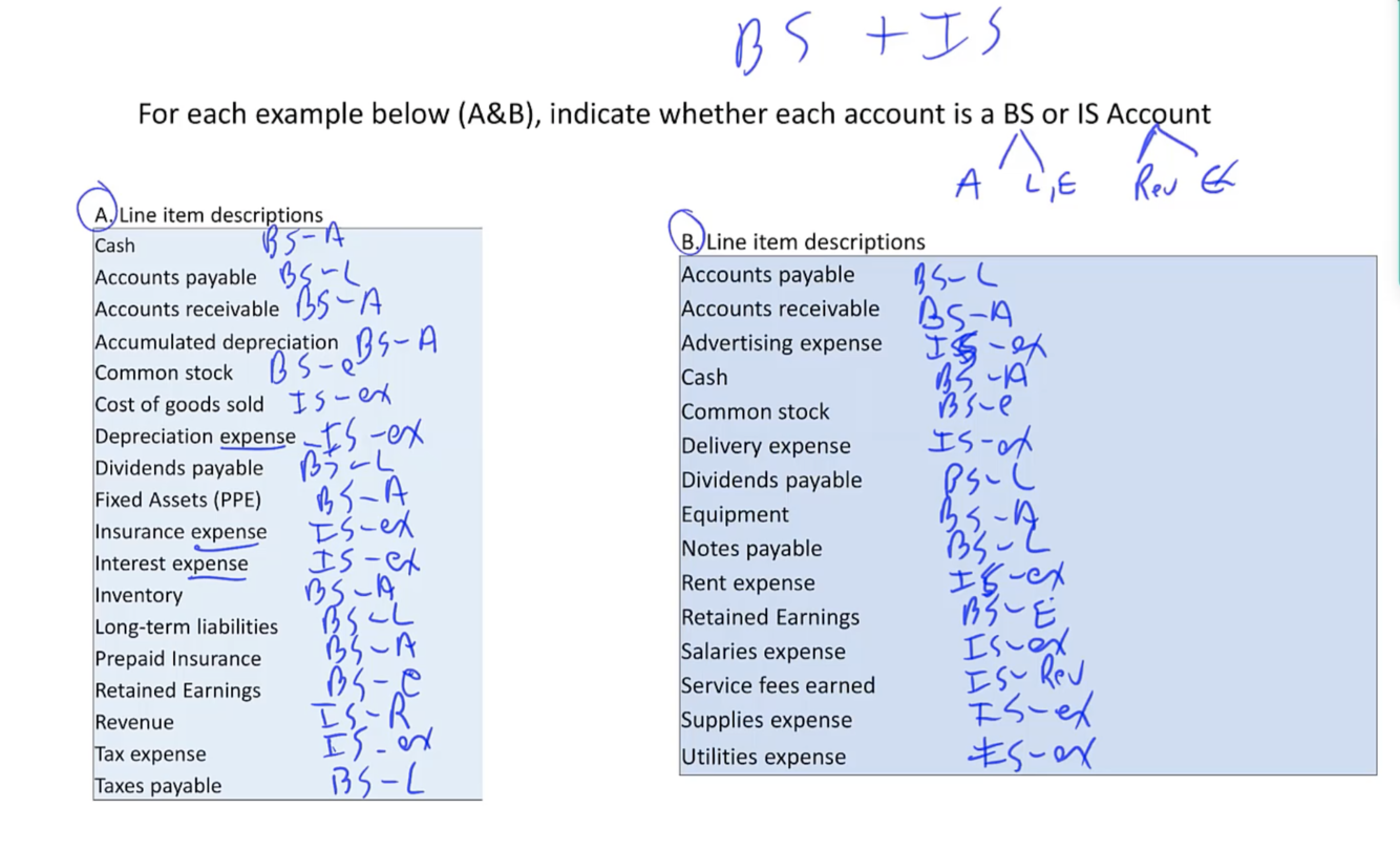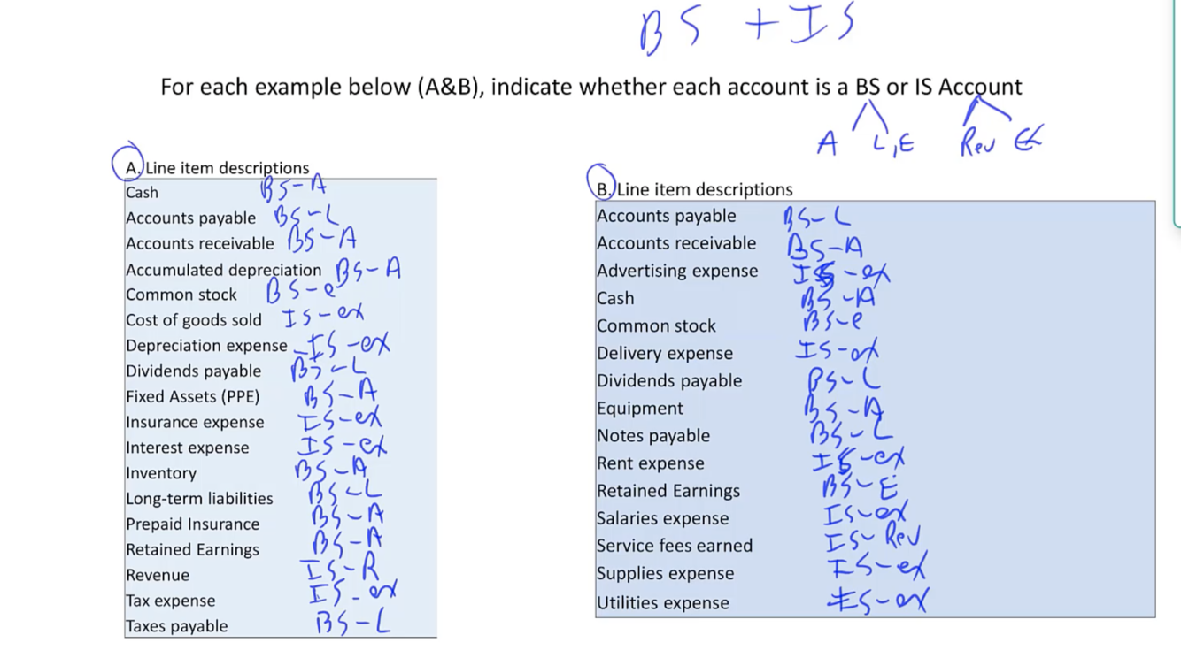 For each example below (A&B), indicate whether each account is a BS or IS Account.