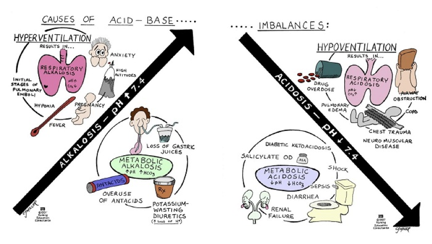 Understand the ABG’s and how to decide if a patient is in resp acidosis or resp alkalosis, Metabolic acidosis, or metabolic alkalosis.