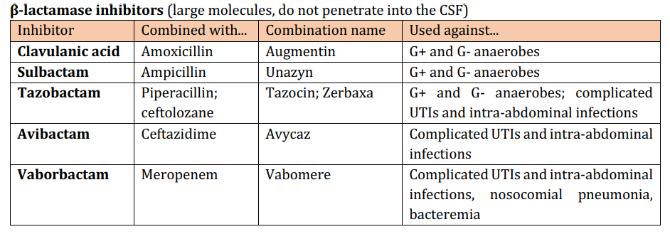 β-lactamase inhibitors (large molecules, do not penetrate into the CSF)