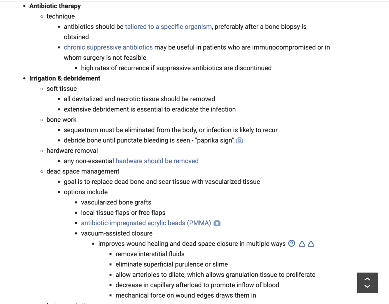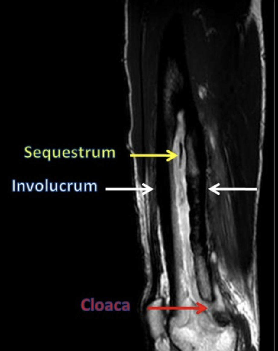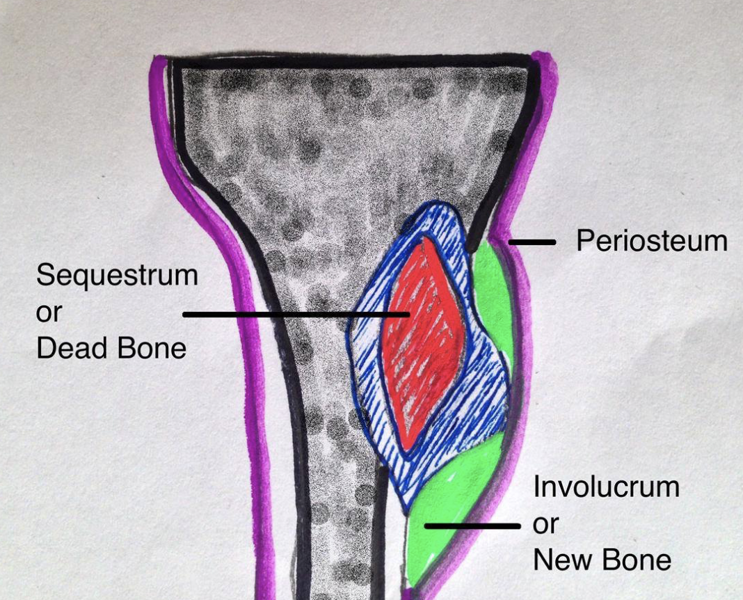 - Irrigation & debridement - sequestrum must be eliminated from the body, or infection is likely to recur; replace dead bone and scar tissue with vascularized tissue