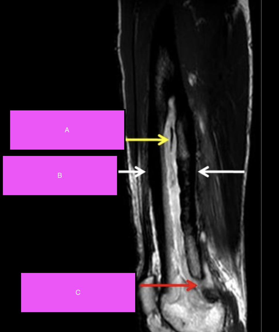 Sequestrum: Refers to a dead piece of devitalised bone that has been separated (i.e. sequestered) due to necrosis from the surrounding bone.